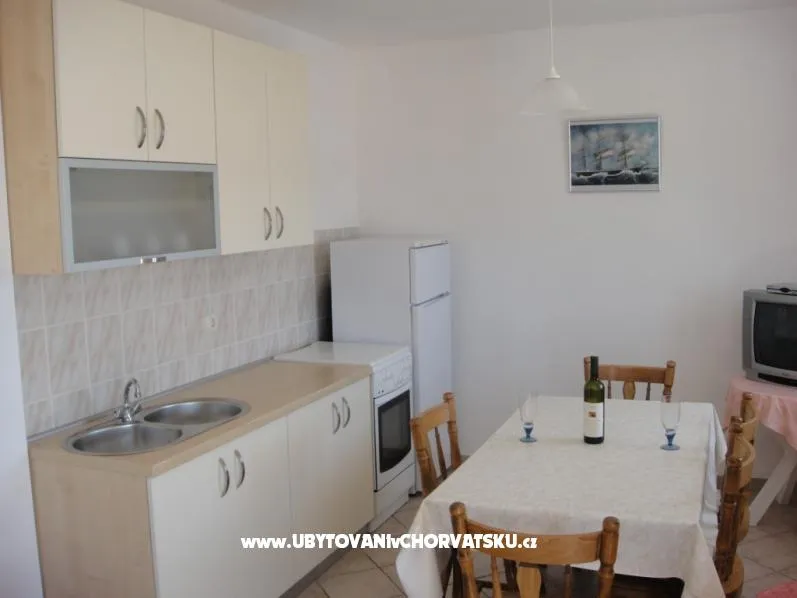 Private accommodation in 3 apartments for rent. 2 apartments 40m2 on the first floor, each for 4 persons and 1 apartment 60m2 on the second floor for 6 people. Each apartment has a balcony / terrace, TV, kitchen, bathroom ... Parking in the backyard, grill. House is 20 m from the sea and beach.Wi-Fi internet.